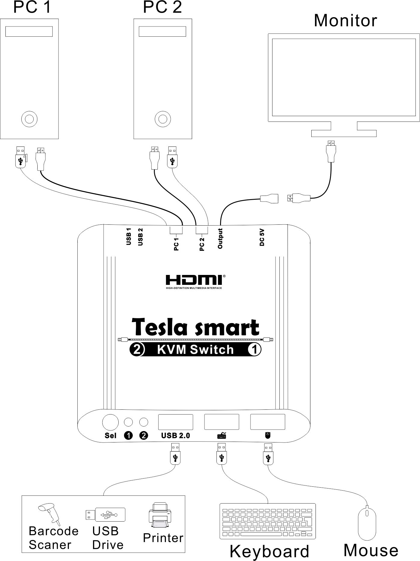 This 2x1 HDMI Cable KVM Switch with two HDMI cable connected to HDMI input port. It makes you available to connect HDMI sources directly. Support USB 2.0 hub and USB 2.0 keyboard/mouse, by using USB port on the KVM, you can connect USB drive, printer, barcode scanner or other USB devices to the KVM. The switch can be control by keyboard hot keys and front panel input selection button.