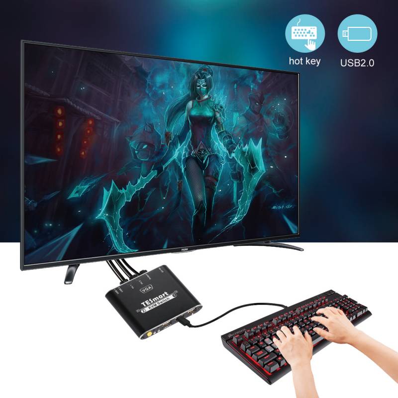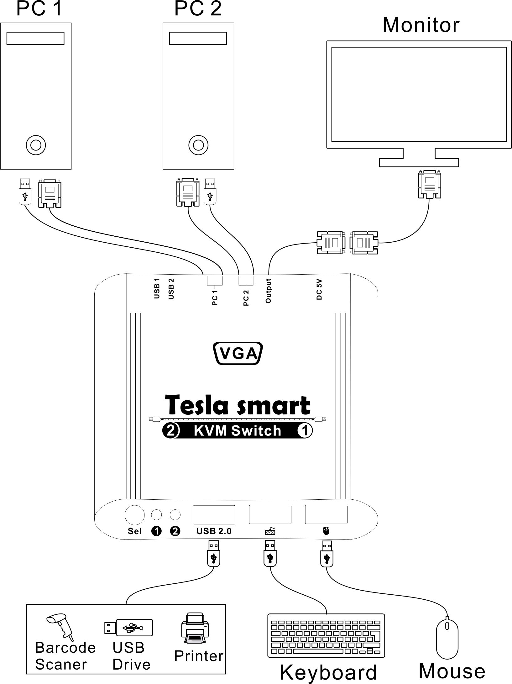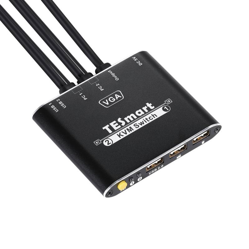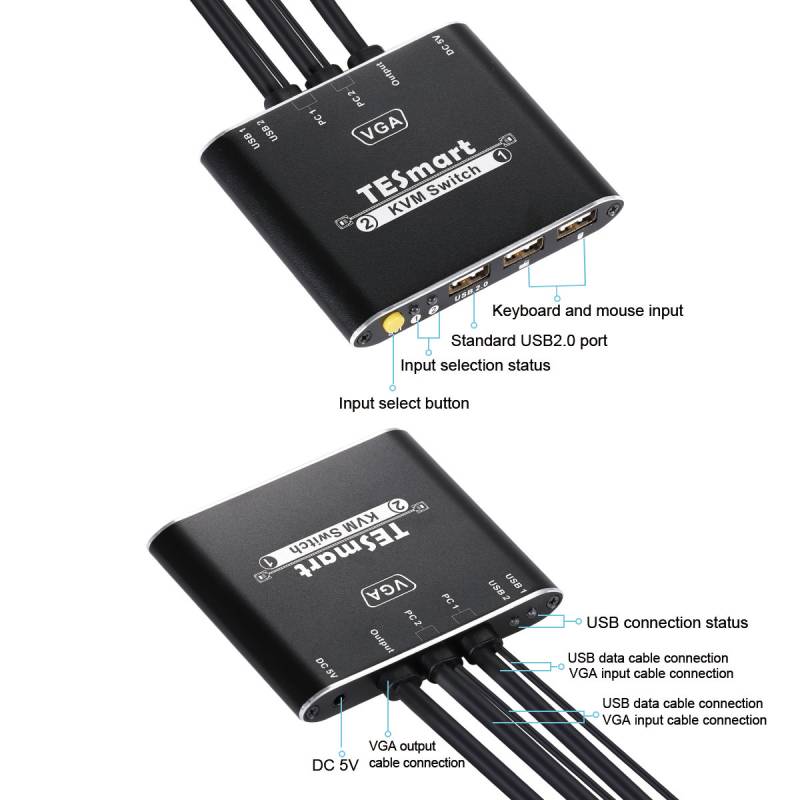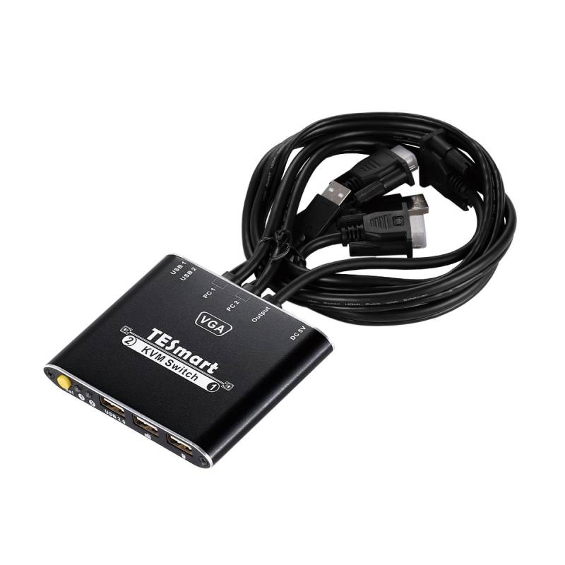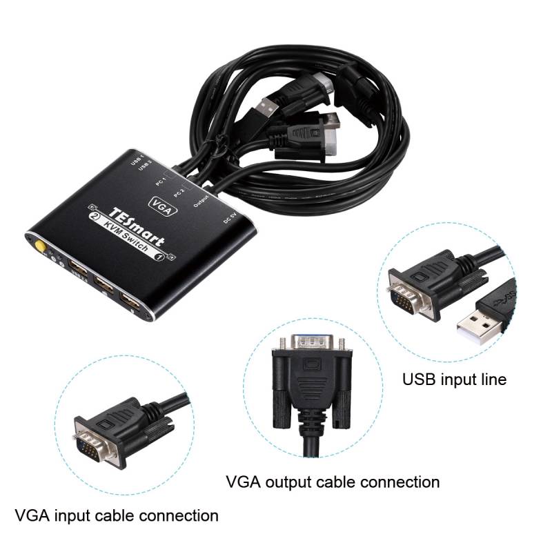 This 2x1 VGA Cable KVM Switch, built-in VGA and USB cables for VGA input connection, it available to connect VGA sources directly. Support USB 2.0 hub and USB 2.0 keyboard/mouse, by using USB hub ports on the KVM, you can attach USB drive, printer, barcode scanner or other USB devices to the KVM. Switch can be control by keyboard hot key and front panel source selector buttons.