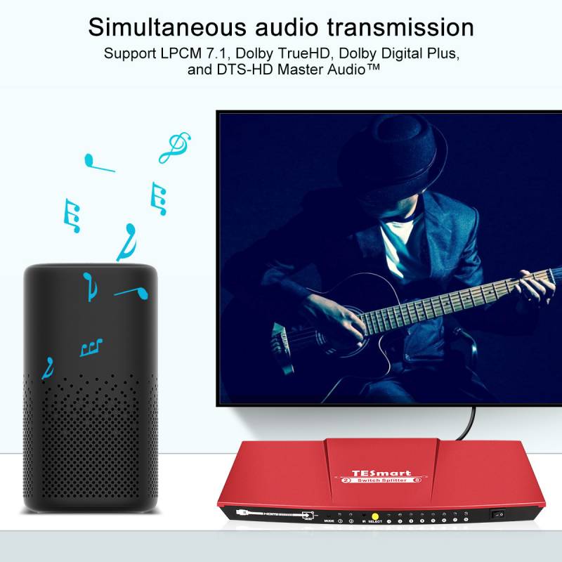 The HDMI splitter (HSP0208A11) for 4K HDMI distributes the one of two Ultra HD HDMI source to eight Ultra HD displays simultaneously, without loss of quality or resolution. This product works with any Ultra HD source and supports resolutions up to 4K. It features Fast Switching Technology, and supports HDCP, Deep Color, 3DTV pass-through, and lossless audio formats such as Dolby® TrueHD and DTS-HD® Master Audio™.