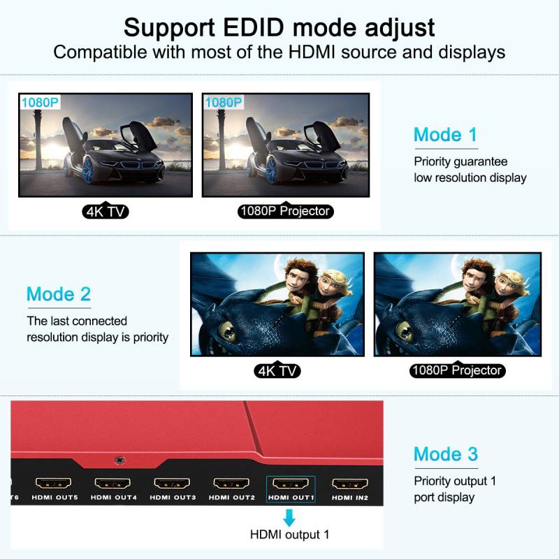 l Support EDID mode adjust, compatible with most of the HDMI source and displays