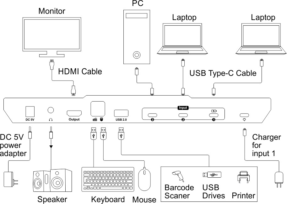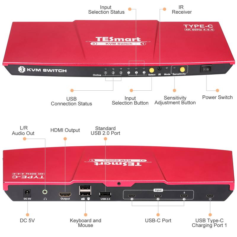 The 3x1 USB Type-C KVM Switch support using a USB-C fast charger to charge the device connected to input port 1. Support Analog L/R audio output. Support USB 2.0 hub and USB 2.0 keyboard /mouse. By using USB 2.0 hub port on the KVM, you can even attach USB drive, printer, barcode scanner or other USB devices to the KVM. Switching can be controlled through variable methods, such as the front panel button, IR signals and hot keys on keyboard. Support keyboard and mouse pass through mode to improve mouse and keyboard compatibility, connect them to the Switch just as you have plugged these devices directly to computer. With EDID emulators in each input port, keep PCs always having correct display information, prevent display settings from changing while switching input ports.
