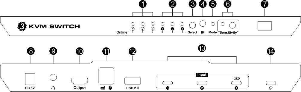 14 | USB Type-C charging port | Connect to USB Type-C fast charger for charging the device connected to Input port 1 |