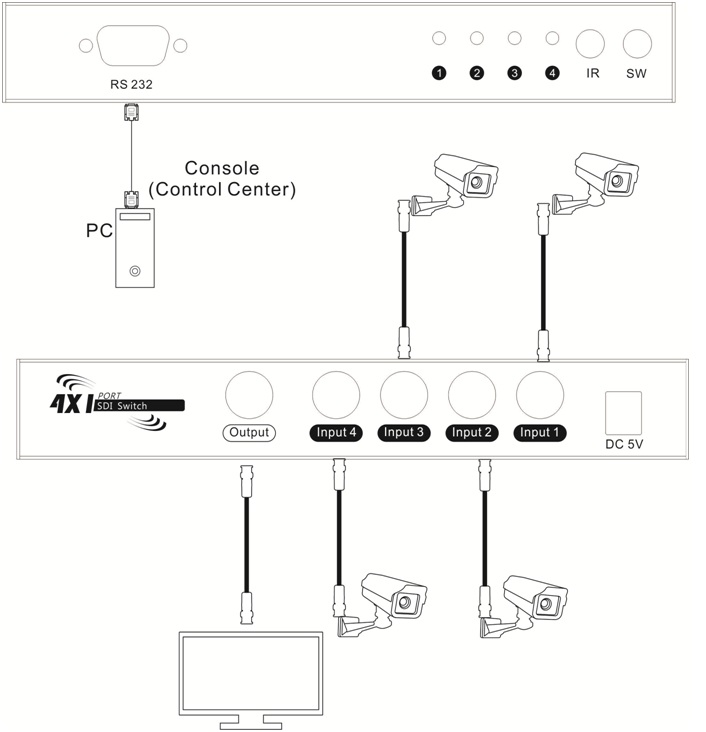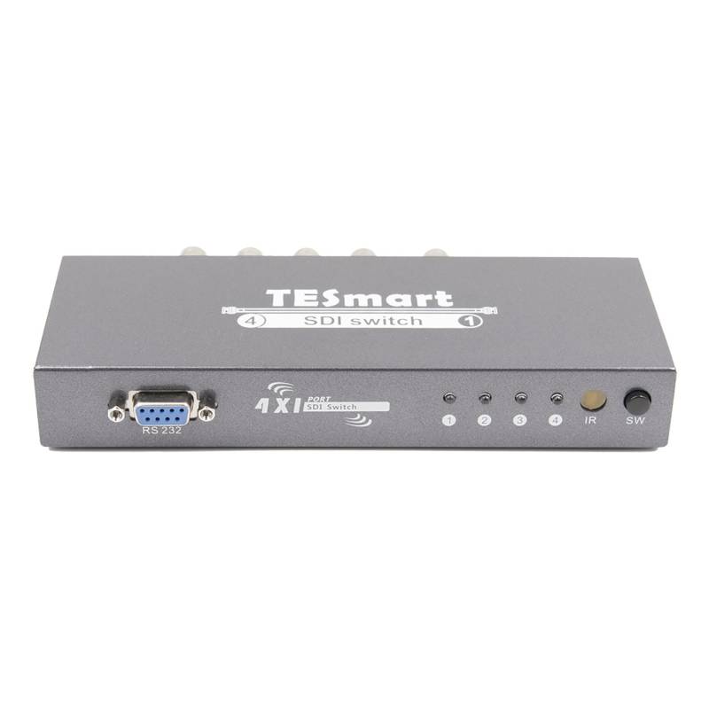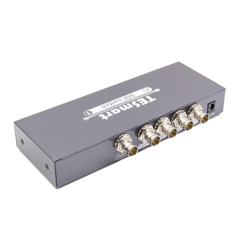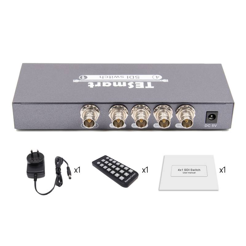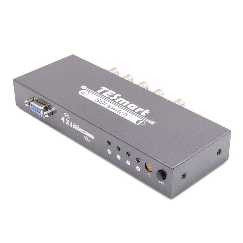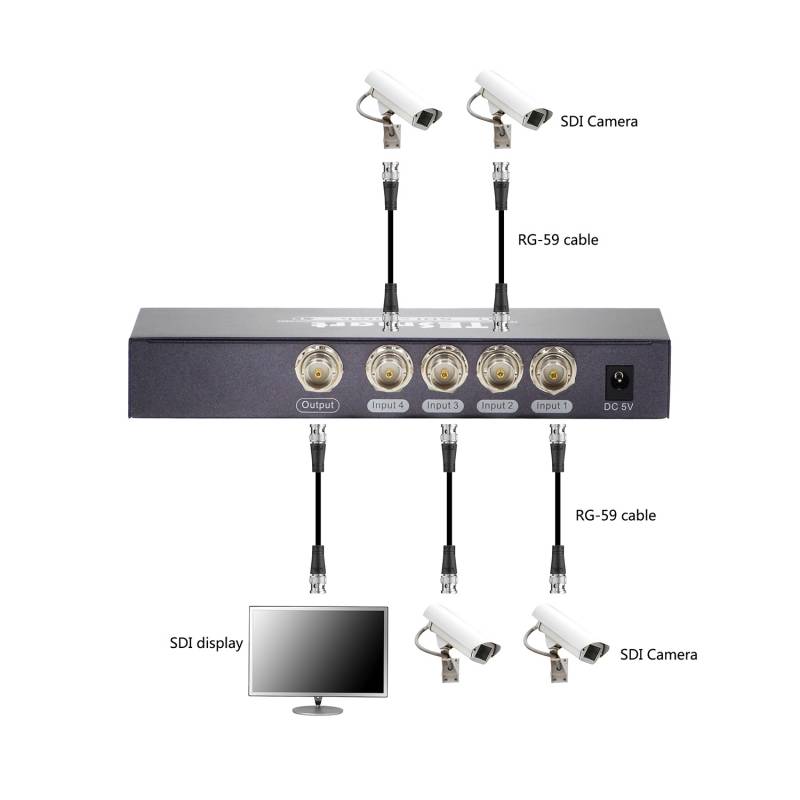 The 4 ports SDI switch, allows up to 4 SD/HD/3G-SDI sources to be routed to one SD/HD/3G-SDI display. Support resolution 480i@60Hz, 576i@50Hz, 720P@50Hz/60Hz, 1080i@50Hz/60Hz, 1080P@24/ 25/ 30/ 50/ 60Hz. Each SD/HD/3G-SDI source can be routed to the display using the front panel switch button, IR remote or PC( via RS 232 port).