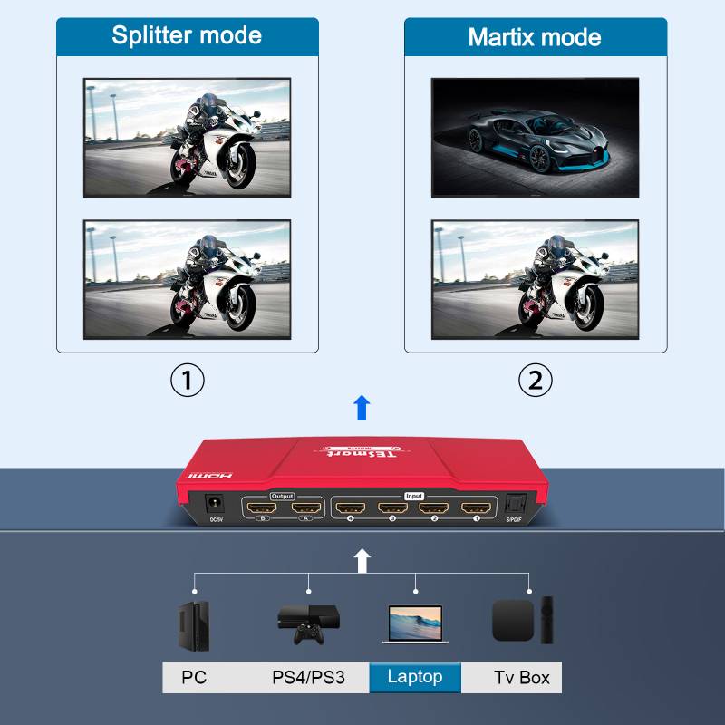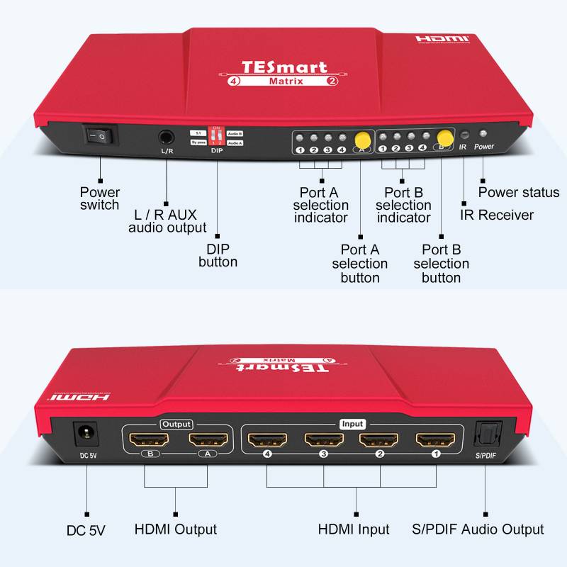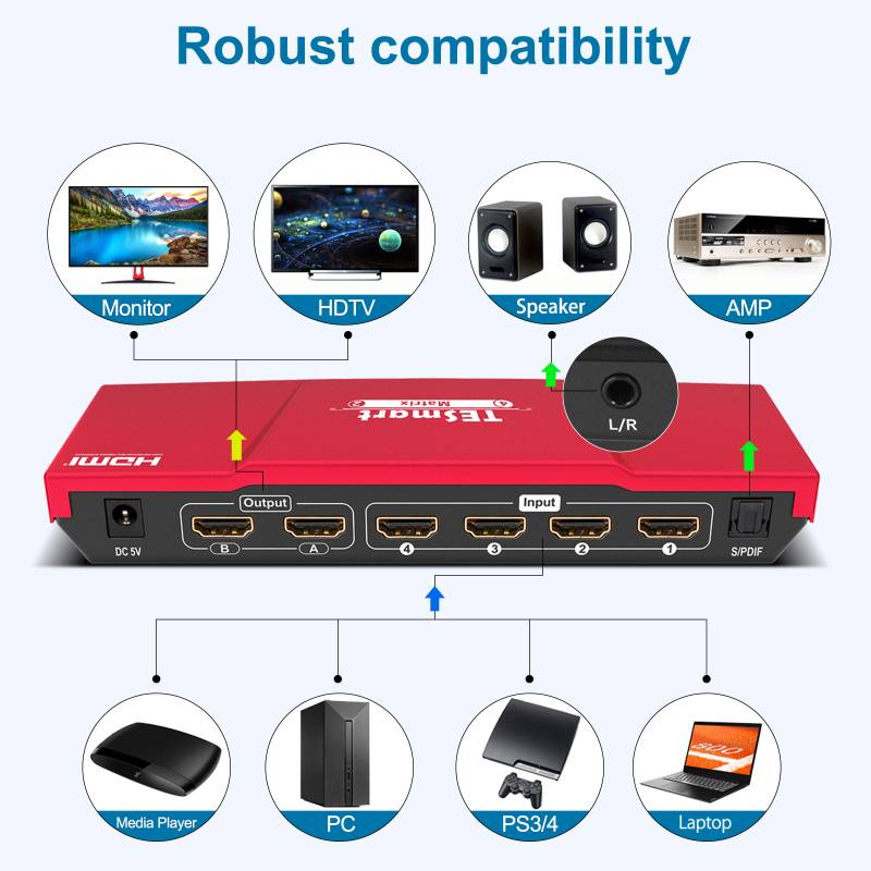 This 4x2 HDMI matrix routes four Ultra HD sources to two 4K Ultra HD displays with HDMI inputs. Each source can be routed to any display, using the front-panel buttons or the IR Remote Control. With smart EDID management, make it compatible with most of the HDMI source and sink devices.