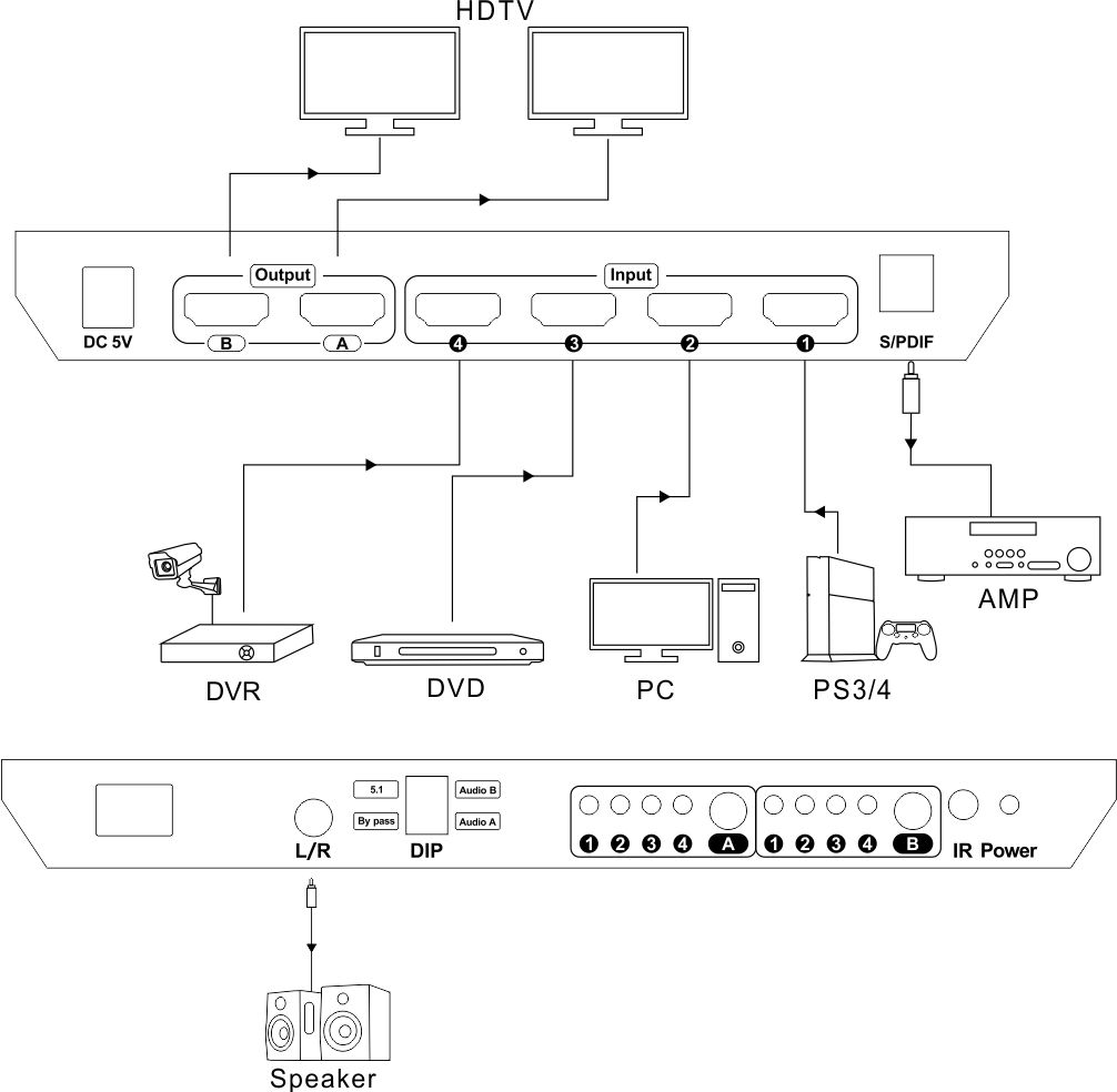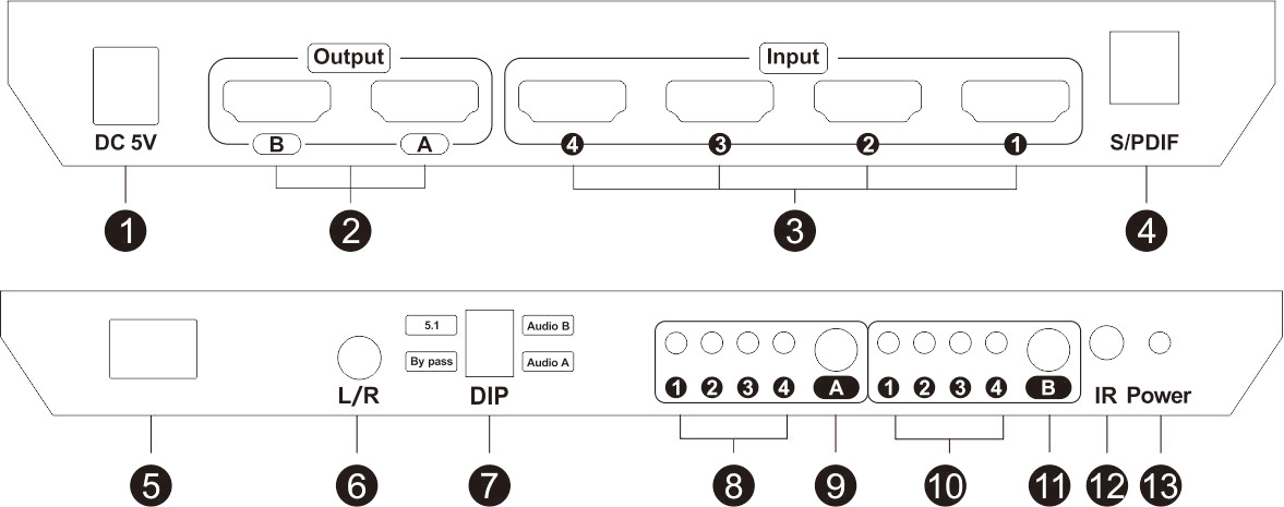 7 | DIP button | 1:Prefer 5.1/By pass audio output 2:Switching to audio output between port A and port B |