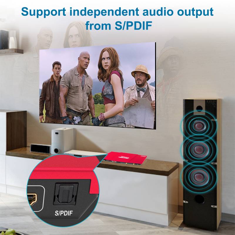 Output | 2*HDMI Type A, 24/26 AWG HDMI cable up to 20M 1*S/PDIF (Coaxial) | ||