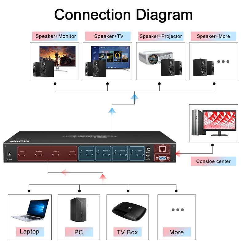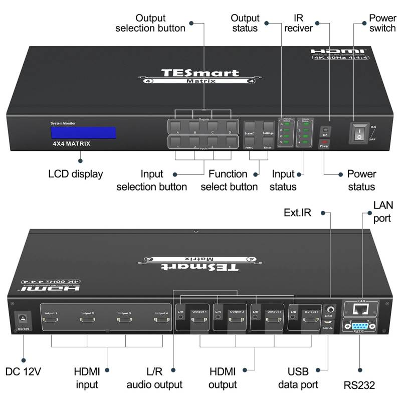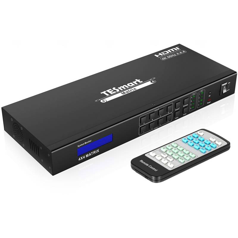 This 4x4 HDMI matrix routes 4 Ultra HD sources to 4 4K Ultra HD displays with HDMI inputs. Each source can be routed to any display using front-panel buttons or IR Remote Control. The matrix can also be controlled via RS232 or LAN port. With smart EDID management, make it compatible with most of the HDMI source and sink devices.