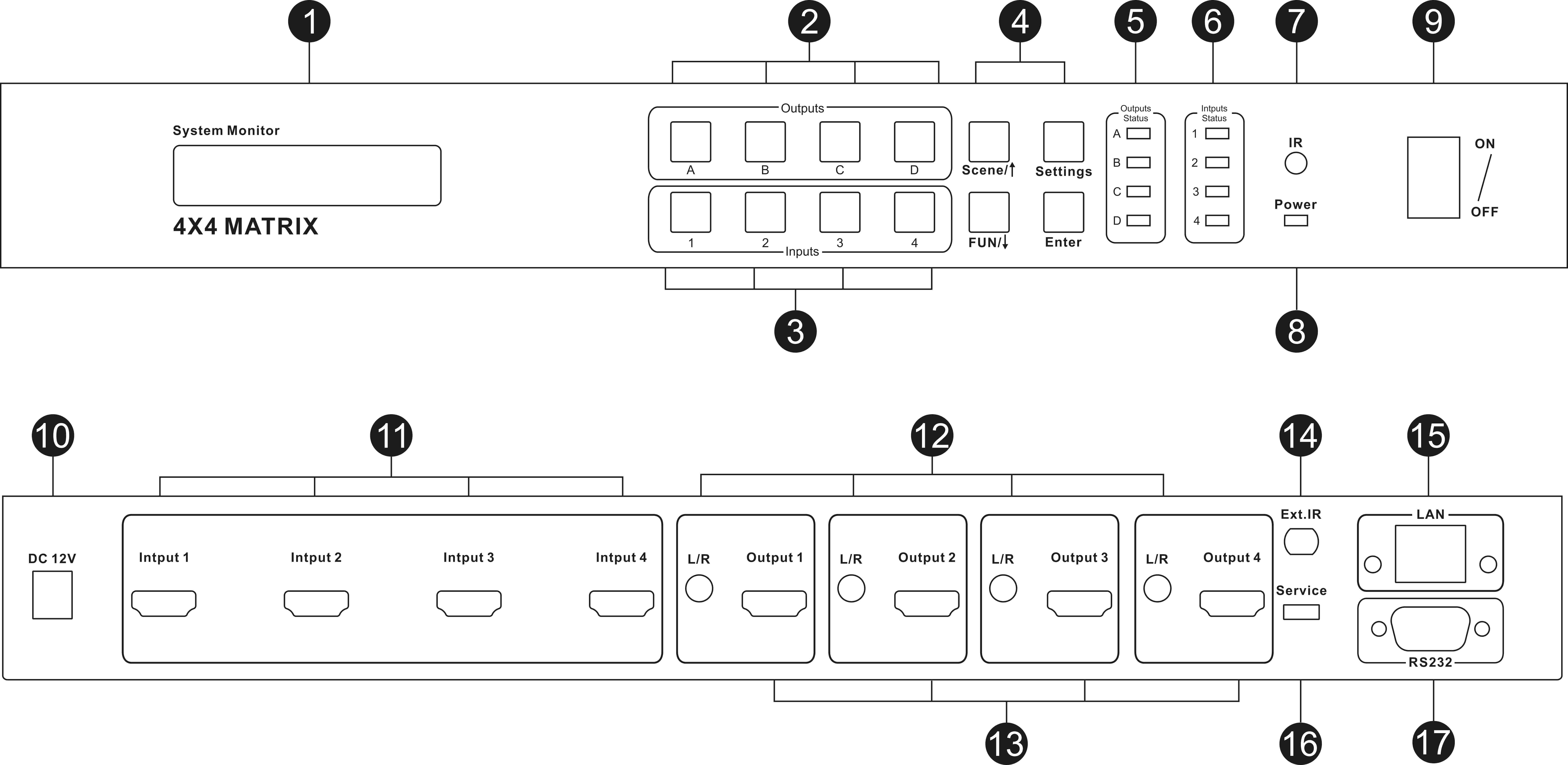 15 | LAN port | Connect to local area network, control matrix by TCP/IP commands |