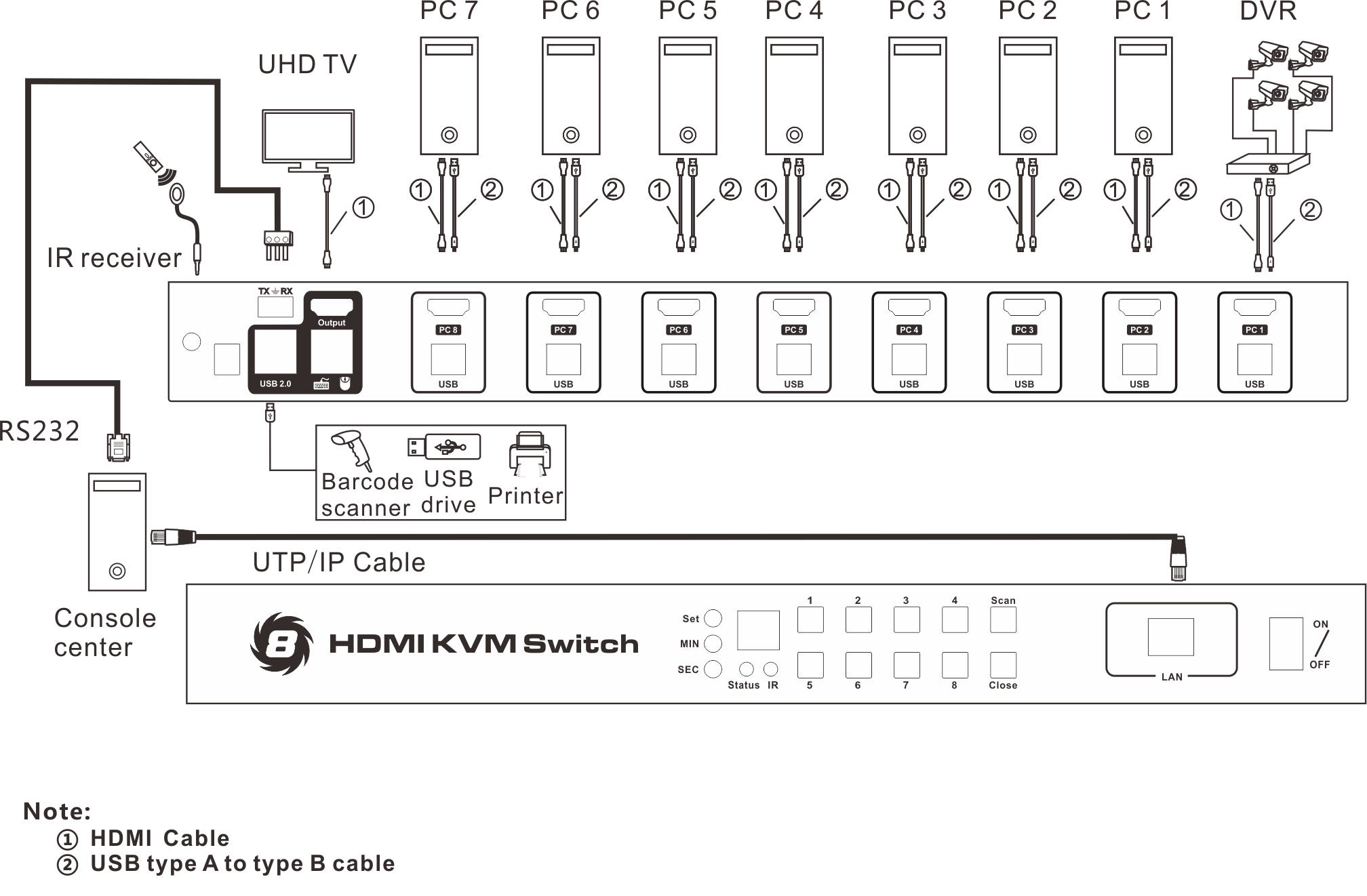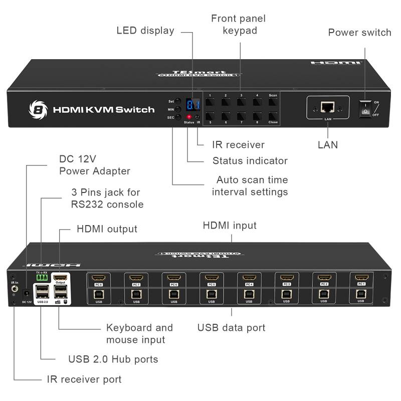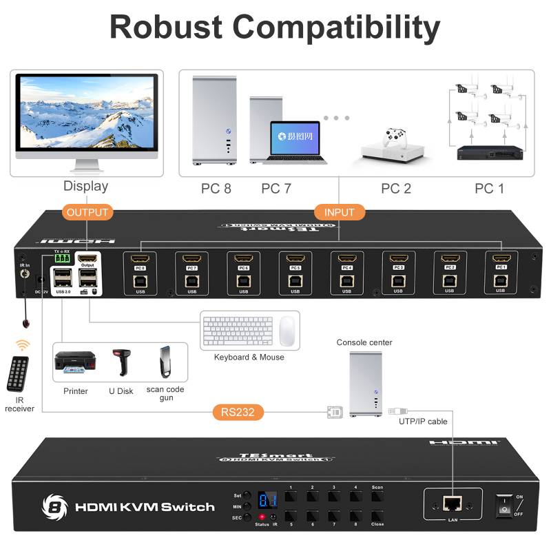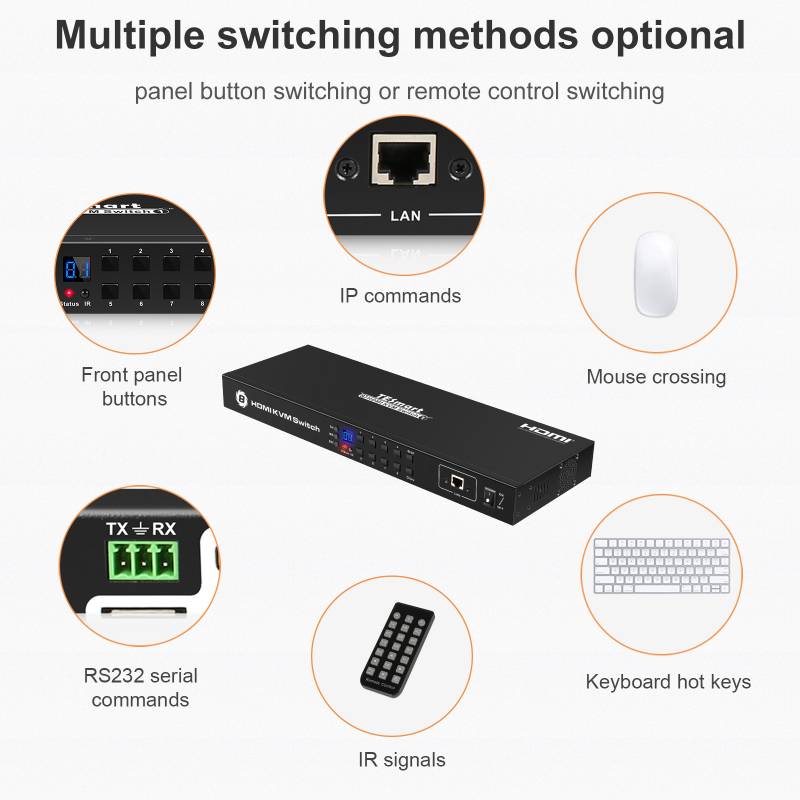 The 8x1 HDMI KVM switch supports USB 2.0 hub and USB 2.0 keyboard /mouse. By using USB 2.0 hub ports on the KVM, you even can attach USB drive, printer, barcode scanner or other USB devices to the KVM. Switching can be controlled through variable methods, such as the front panel source selector buttons, RS232 commands, IP commands, IR signals and hot keys on keyboard.