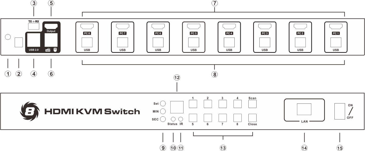 13 | Keypad | [1~8]: Press these buttons to directly select input 1~8 sources [Close]: Press this button directly will turn on or turn off the displays [Scan]: Press this button to start or stop automatically scan between input 1 to input 8. The interval time can be set by buttons [Set], [MIN], [SEC] as described above |